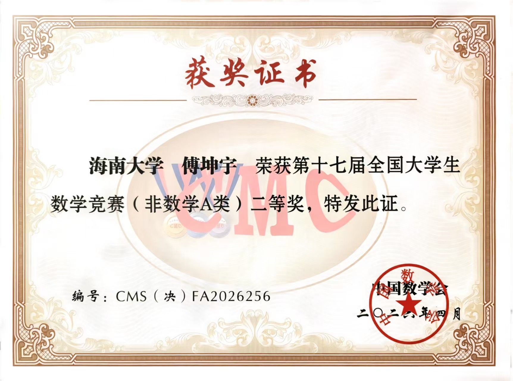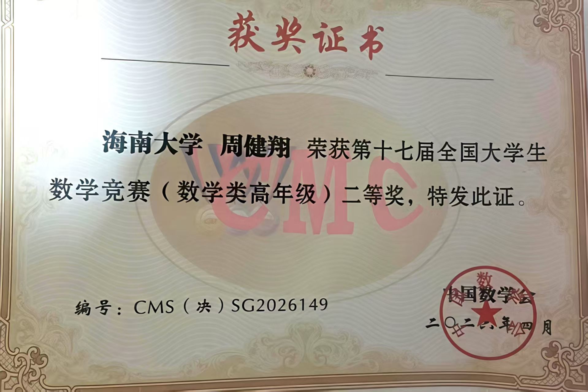 4月18日,第十七届全国大学生数学竞赛决赛在四川大学落幕。海南大学学生表现优异:2023级数学与应用数学(基地班)周健翔获数学类高年级组二等奖;2022级数学与应用数学詹发雄、2024级数学与应用数学(基地班)叶天浩分获高年级组与低年级组三等奖;2023级土木工程傅坤宇获非数学专业A类二等奖;2024级应用物理张富凯获非数学专业A类三等奖。本次竞赛团队指导老师为陈颖,罗志丹,符一平。
